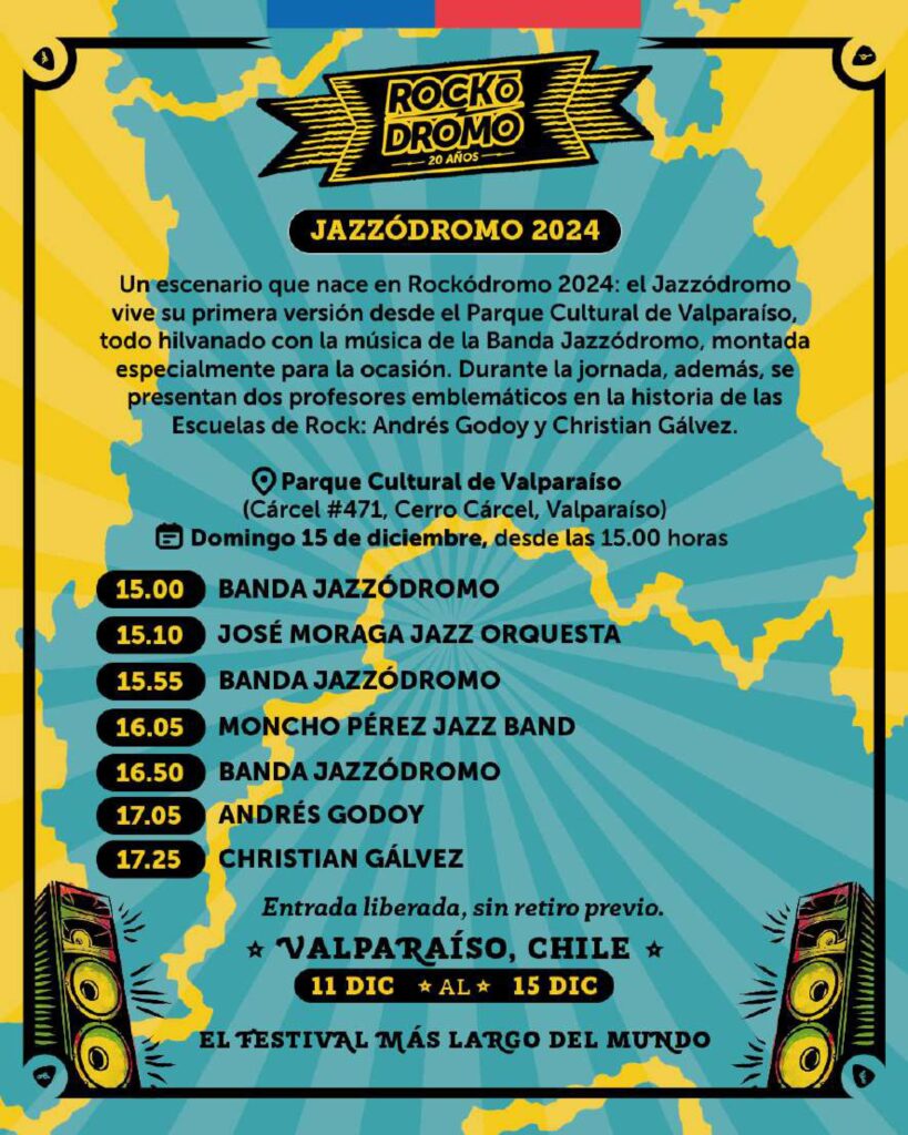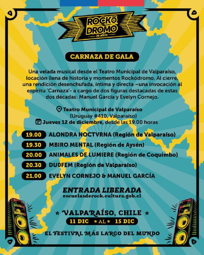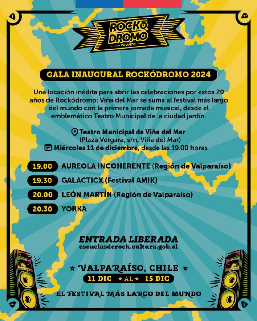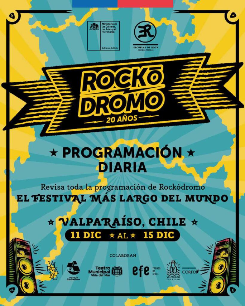 Durante cinco días la música nacional retumbará fuerte en distintos puntos de la Región de Valparaíso. Se trata de la celebración de los 20 años del festival Rockódromo, organizado por el Ministerio de las Culturas, las Artes y el Patrimonio a través del programa Escuelas de Rock y Música Popular, que se realizará del 11 al 15 de diciembre con entrada liberada.