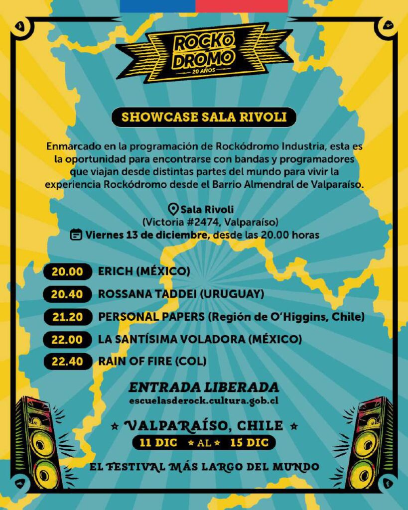 Como parte de la programación de Rockódromo Industria, el viernes 13 se realizarán los showcases en Sala Rivoli (Victoria #2474, Valparaíso), desde las 20 horas y previa reserva de entradas en passline.cl.