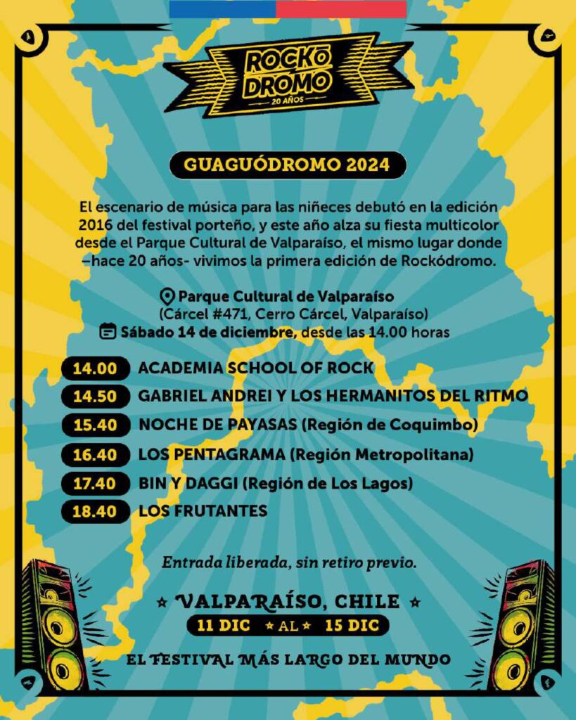 El sábado 14 el público infantil tiene su escenario Guaguódromo en el Parque Cultural de Valparaíso, mismo recinto que al día siguiente recibe al Jazzódromo. Ambas jornadas son desde las 15.00 horas y no requieren retiro previo de entradas.