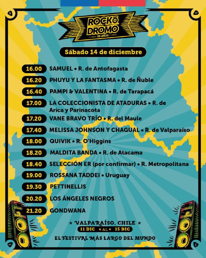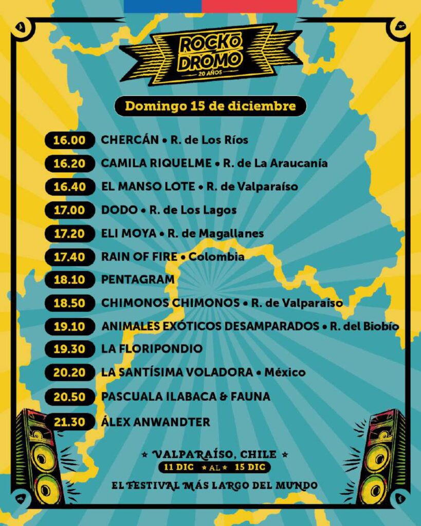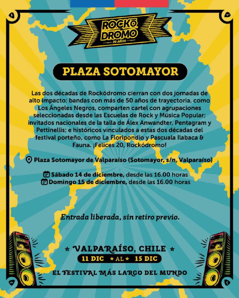 ¿Dónde? ¿Cuándo? Las dos décadas de Rockódromo cierran con dos jornadas en la Plaza Sotomayor (desde las 16.00 horas), donde bandas con más de 50 años de trayectoria, como Los Ángeles Negros, comparten cartel con agrupaciones seleccionadas desde las Escuelas de Rock y Música Popular; invitados nacionales de la talla de Álex Anwandter, Pentagram y Pettinellis; e históricos vinculados a estas dos décadas del festival porteño, como La Floripondio y Pascuala Ilabaca & Fauna. Acá los horarios de cada jornada: