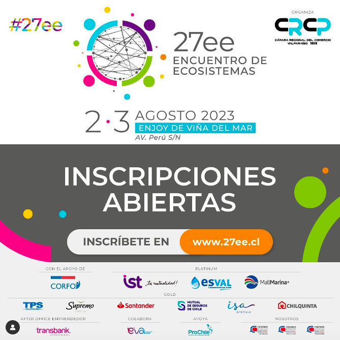 Con la presencia de autoridades, representantes del mundo empresarial, emprendedores, académicos y de todos quienes han contribuido a posicionar a la región de Valparaíso como una de las principales plataformas para la innovación y el emprendimiento dentro de la economía nacional, la Cámara Regional del Comercio de Valparaíso (CRCP) realizará nueva versión del Encuentro Empresarial, 27ee: Encuentro de Ecosistemas 2023, los próximos 2 y 3 de agosto en el Enjoy de Viña del Mar. Gracias al apoyo de Corfo, EIVA y diversas empresas socias.