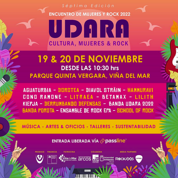 ARCOS PATROCINA UDARA, ENCUENTRO DE MUJERES Y ROCK. Se trata de la séptima edición del encuentro que se realiza el 19 y 20 de noviembre en la Quinta Vergara.