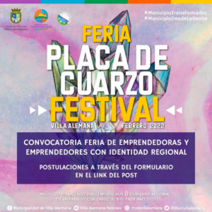 Si eres emprendedor o emprendedora y tienes productos con identidad regional, o cuentas con un foodtrucks al día, la Municipalidad de Villa Alemana te invita a ser parte de la Feria de 30 stand que serán parte este 25, 26 y 27 de febrero del Placa de Cuarzo Festival, evento que reunirá 18 bandas regionales en el Estadio ANFA de la Población Prat.