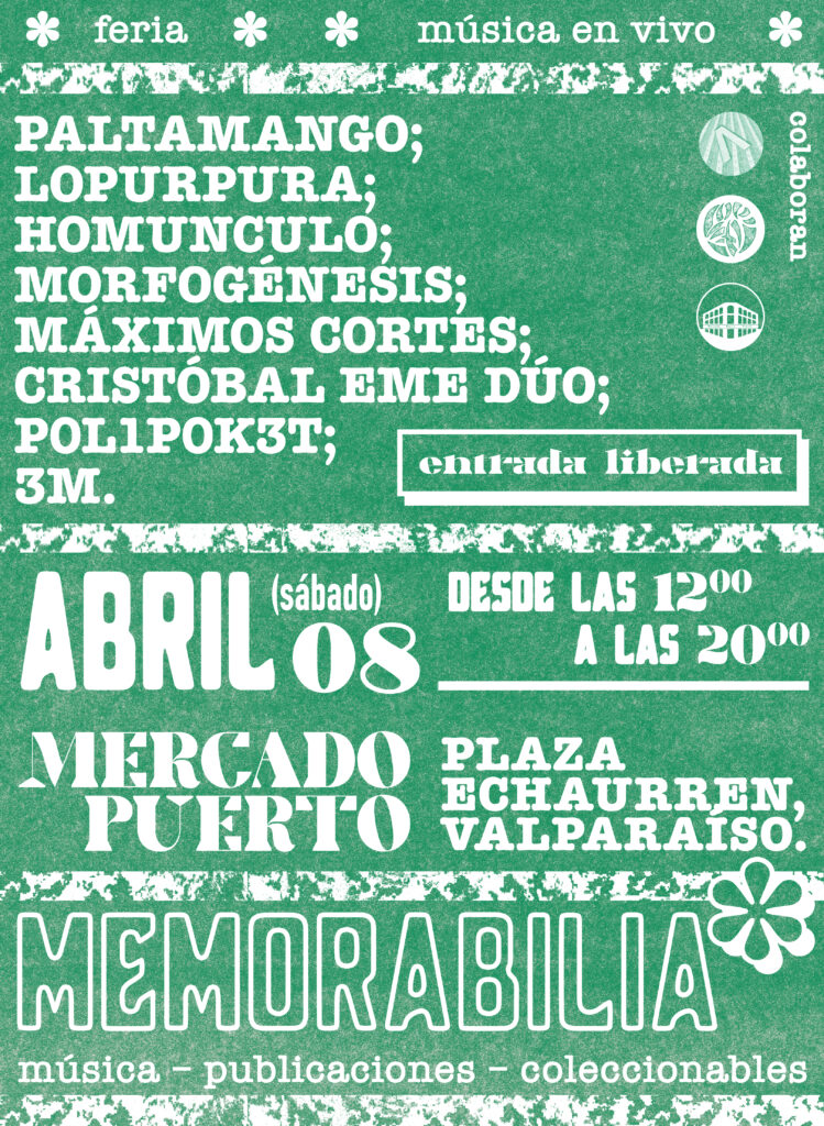 La próxima versión de Memorabilia será realizada en Mercado Puerto, Valparaíso, a pasos de la Plaza Echaurren en Barrio Puerto. Se realizará el sábado 8 de abril entre 12:00 y 20:00 hrs. La entrada es liberada.