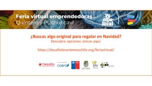 Desafío levantemos Chile invita a participar de la nueva vitrina virtual de Quintero y Puchuncaví. Para la instancia fueron seleccionadas 20 emprendedoras de las Comunas (10 emprendedoras de cada comuna) quiénes fueron beneficiadas con: sesión fotográfica para potenciar el marketing visual, asesorías personalizadas en el uso manejo de redes sociales para mejorar las acciones de marketing digital y comercialización de los emprendimientos puestos en esta vitrina virtual que será de gran utilidad para las emprendedoras en los ámbitos de: posicionamiento, difusión y comercialización de sus productos en canales digitales complementando además las ventas de sus respectivos canales físicos.