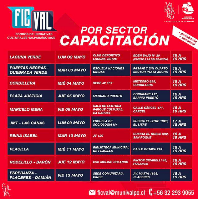 Desde el lunes 9 comienzan las capacitaciones en diferentes territorios de la comuna donde se detallará todo lo que necesitas saber para postular tus proyectos en la nueva versión de los Fondos Municipales para Iniciativas Culturales de Valparaíso, FICVAL 2022.