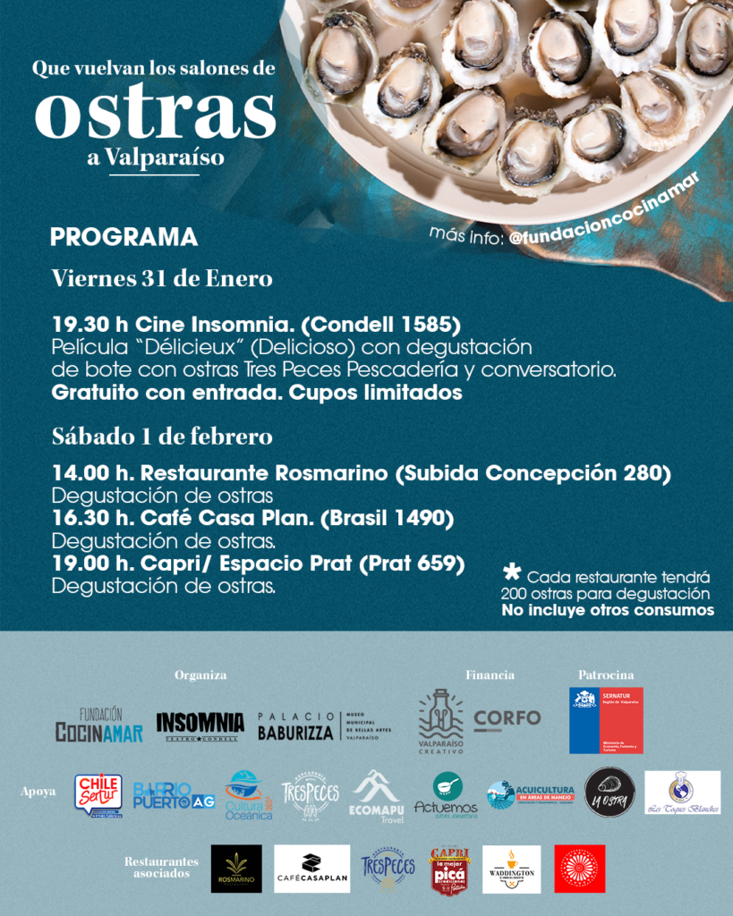 La primera activación será este viernes 31 de enero a las 19:30 en el Cine Insomnia, donde se proyectará la película “Délicieux” y habrá una degustación de ostras de la pescadería Tres Peces, junto con un conversatorio. Los cupos están totalmente agotados, pero existirán otras instancias para revivir con nosotros esta tradición.