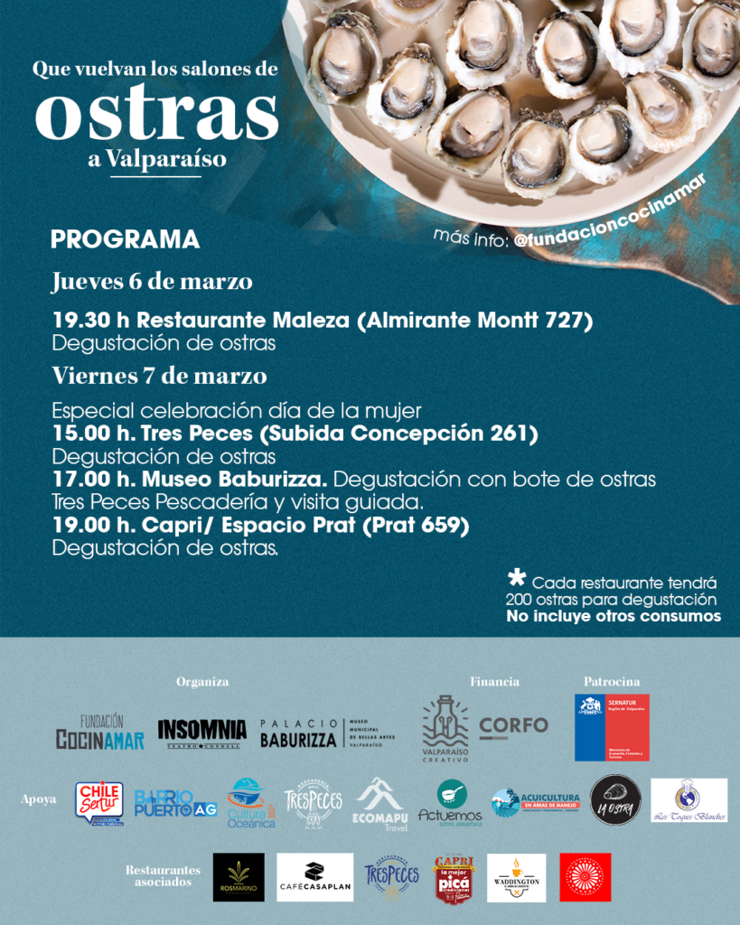 Finalmente, Rafael Torres, del Museo Baburizza, comparte su entusiasmo: “Estamos muy contentos de ser parte de esta actividad, junto a instituciones que siempre han velado por la difusión del patrimonio local. Queremos que los porteños puedan disfrutar de una jornada tan tradicional como lo fueron los salones de ostras en Valparaíso, con el objetivo de que se reactiven con el tiempo. Estamos seguros que esta jornada reunirá a toda la familia”.