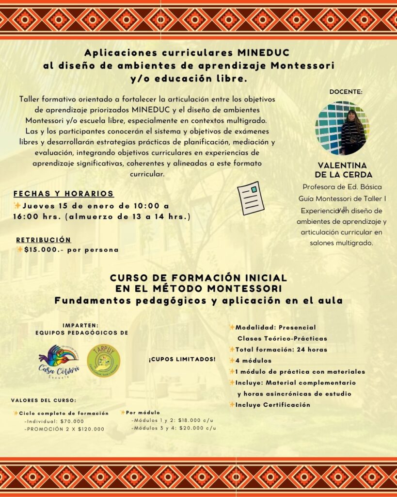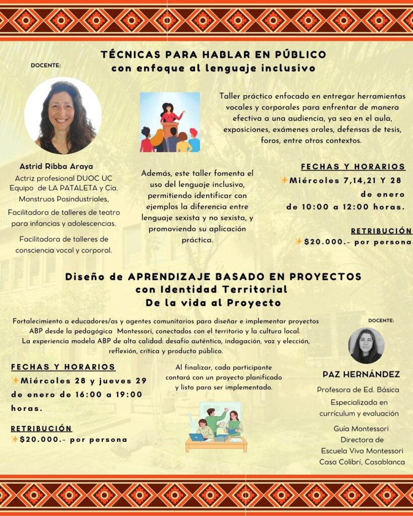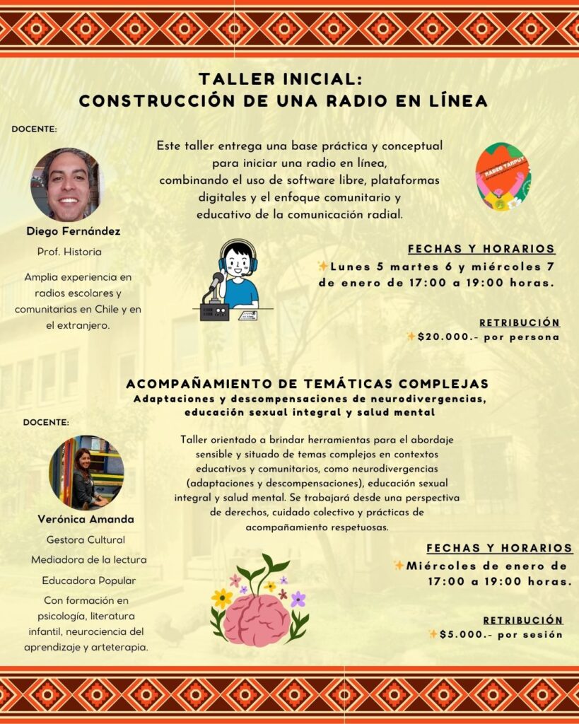 La escuela contempla una amplia oferta de cursos, entre los que destacan: producción cultural comunitaria, radio online comunitaria o escolar, una formación inicial en el Método Montessori, Aprendizaje Basado en Proyectos (ABP) con identidad territorial, aplicaciones curriculares MINEDUC en educación libre, teatro y juego como herramientas pedagógicas, técnicas para hablar en público con enfoque en lenguaje inclusivo, acompañamiento de temáticas complejas como neurodivergencias, educación sexual integral y salud mental, y espacios de escritura terapéutica.