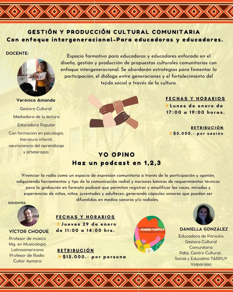 El Centro Cultural, Social y Educativo Tarpuy anuncia la realización de la Escuela de Formación Continua de Saberes Comunitarios, una propuesta formativa presencial que se desarrollará entre el 5 y el 29 de enero en su sede ubicada en San Pedro #321, Playa Ancha, Valparaíso.
