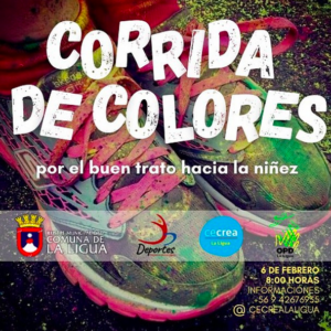 El próximo 6 de febrero será la «Corrida de Colores» que Cecrea La Ligua está organizando. Esta actividad pretende sensibilizar a la comunidad de La Ligua y la provincia de Petorca en general y en particular a instituciones, organizaciones y entidades públicas y privadas sobre la cultura del buen trato hacia niñas, niños y jóvenes, a través de una actividad socio deportiva inclusiva, la cual permite la participación de todas las personas, sin exclusiones de ningún tipo.