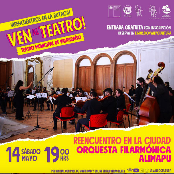 Este SÁBADO 14 de mayo a las 19 hrs, tras dos años producto de la pandemia, la Orquesta Filarmónica Alimapu de Valparaíso vuelve de manera presencial con un concierto de larga duración en el Teatro Municipal de Valparaíso.