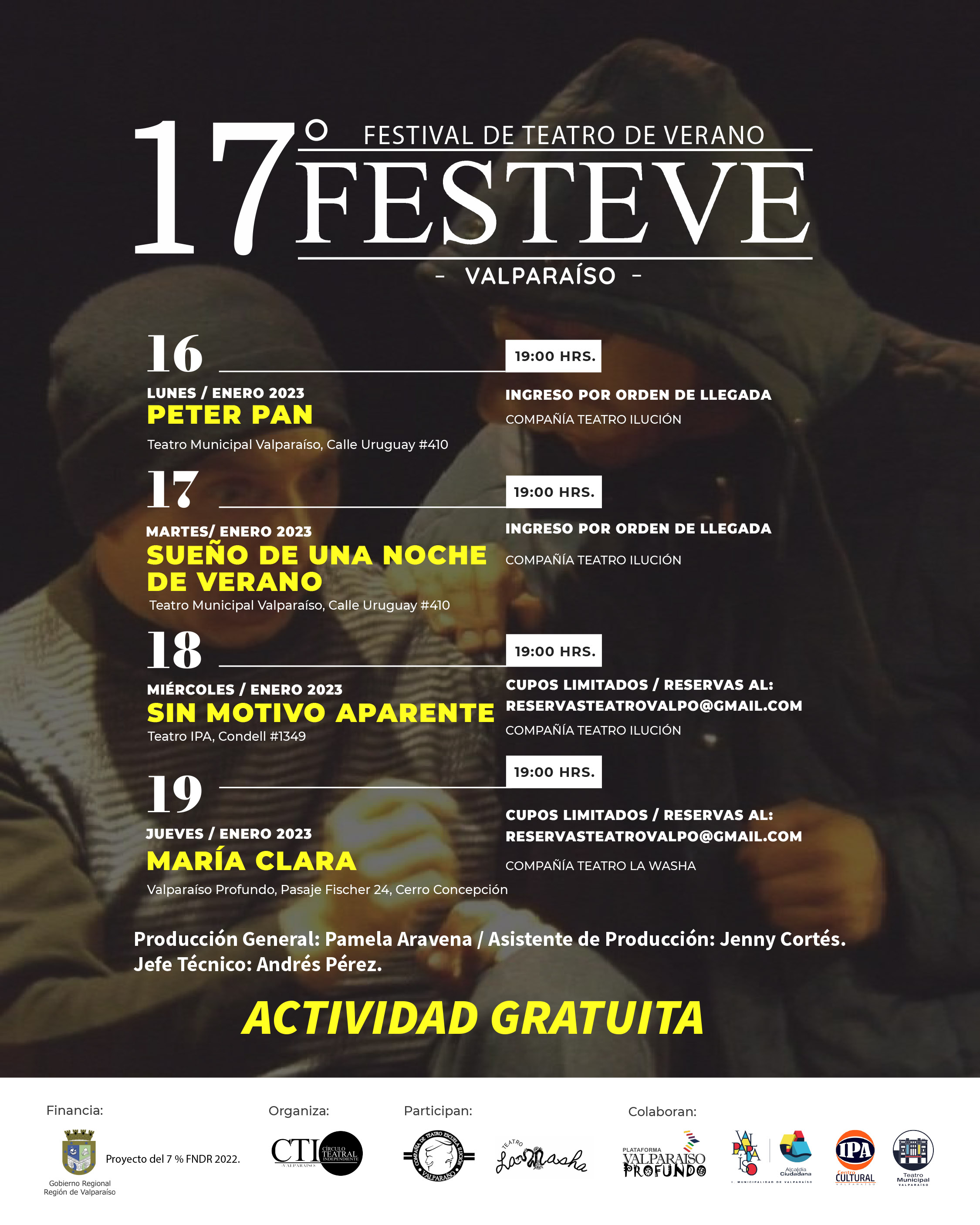 Este emblemático evento estival se iniciará el lunes 16 y el martes 17 de enero en el Teatro Municipal de Valparaíso, el miércoles 18 en la sala de teatro IPA y el jueves 19 finaliza en la sala de teatro Arnaldo Berrios del espacio Valparaíso Profundo, todas las presentaciones están fijadas a las 19°° horas y la entrada es Liberada.