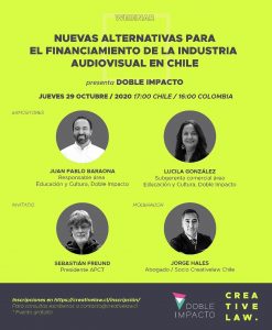 El próximo jueves 29 de octubre Creative Law invita a un webinar junto a Doble Impacto donde hablaremos sobre las nuevas alternativas para financiar y potenciar la industria audiovisual en Chile. ¡Y es totalmente gratuito!